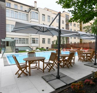 Tento tradičně zařízený byt se nachází ve 2. patře dobře udržovaného činžovního domu s výtahem. Interiér bytu se skládá z otevřeného obývacího pokoje s kuchyňským koutem zařízeným kvalitními spotřebiči, 2 ložnic a 2 koupelen. K vybavení bytu patří pračka se sušičkou, koberce, nádobí, skleničky, kompletní sady hrnců, příbory, perské koberce, LCD televizory, ložní prádlo, bezpečnostní dveře, videotelefon, satelitní TV. Klimatizace. Úklid jednou týdně v ceně. Současně se zachováním všech architektonických prvků je dům vybaven i komfortem pro pohodlné a příjemné bydlení. Obyvatelům domu k dispozici po celý rok vyhřívaný krytý bazén s vodní masáží a sauna. Dále je k dispozici velká rozkvetlá zahrada. Pokud se rozhodnete trávit volný čas v zahradě nebo u bazénu, jen těžko uvěříte, že žijete v takovém velkoměstě, jakým je Praha.