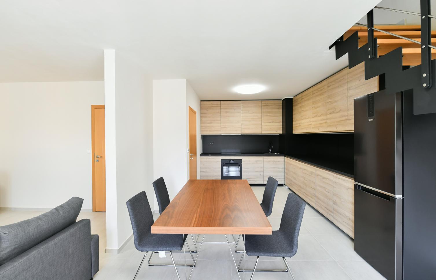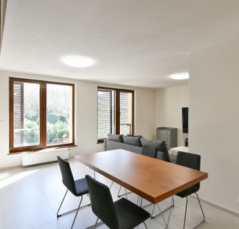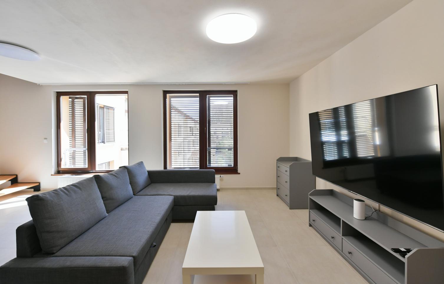 Kvalitní materiály a vybavení, na podlahách parkety a mramorová dlažba, bezpečnostní vstupní dveře, TV, kamerový systém a noční vrátný v objektu. K dispozici 1 parkovací stání v podzemní garáži v budově za 2000 Kč měsíčně + DPH. Internet 400 Kč, energie dle vlastní spotřeby. Za poplatek 500 Kč je možno využít posilovnu a saunu. Možnost krátkodobého pronájmu za vyšší nájemné (min. 3 měsíce).
