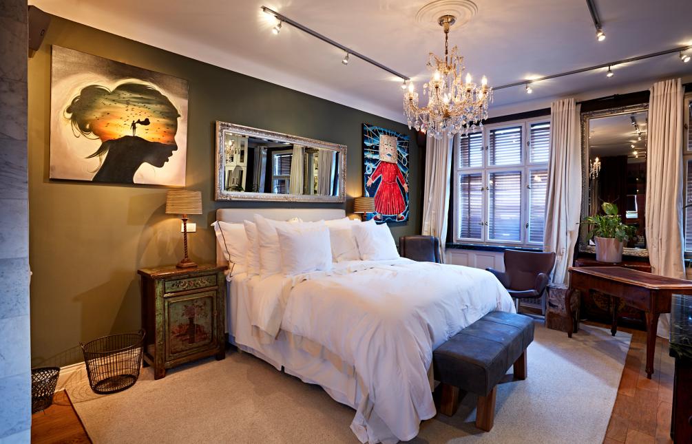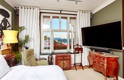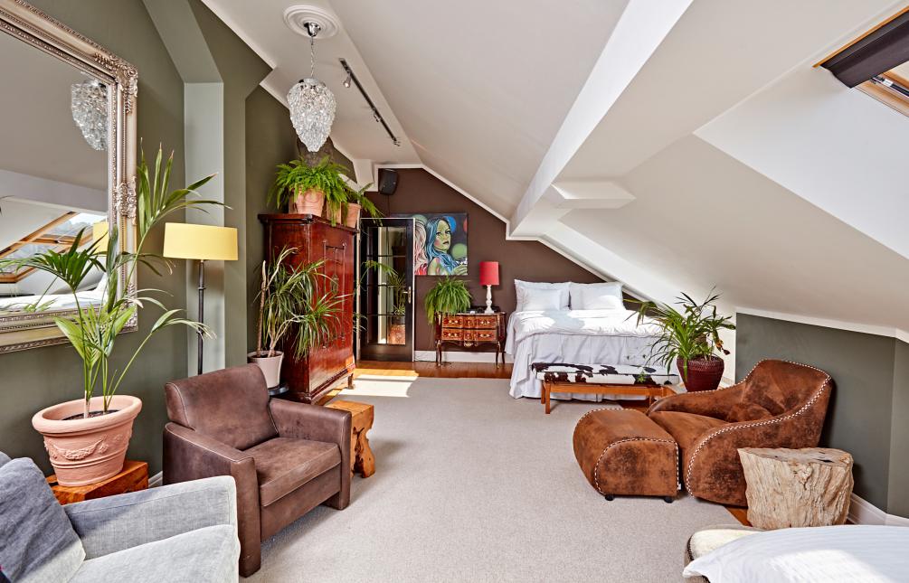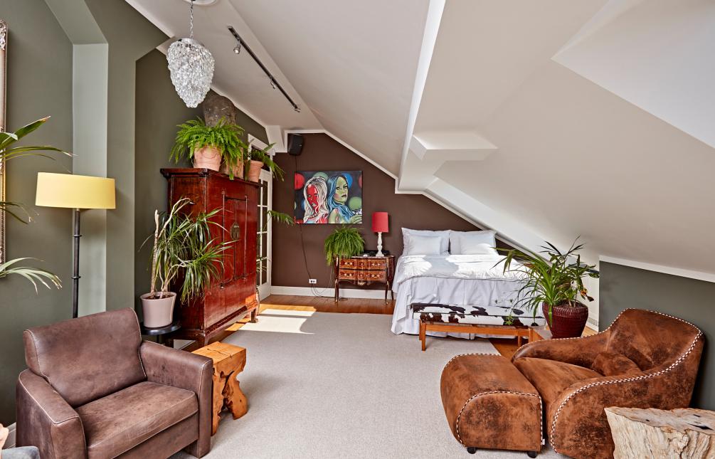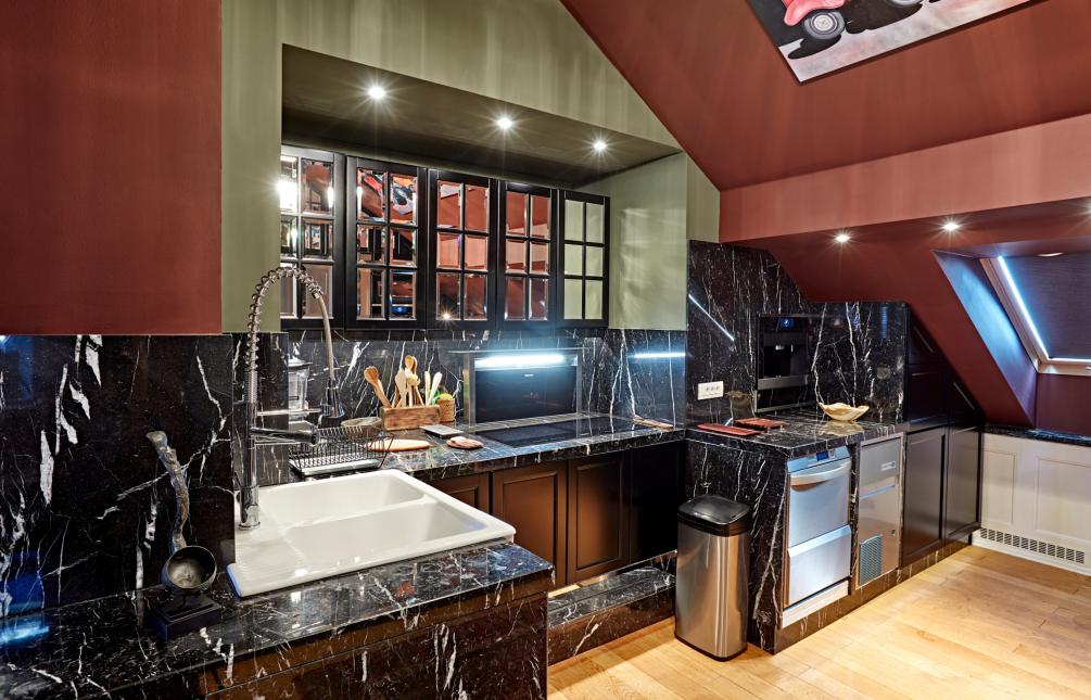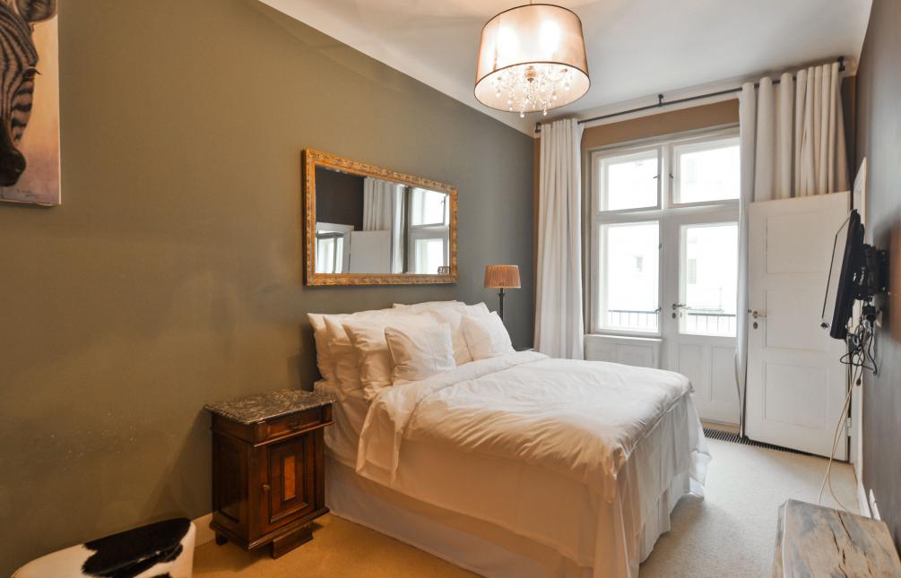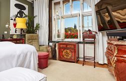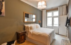 Pozornost přitahují kvalitní materiály, starožitnosti, perské koberce, obrazy. Parketové podlahy, dlažba, mramorové koupelny, arkýřové výklenky, pára, sauna, pračka, sušička, TV, alarm, satelitní příjem a kamerový systém. Parkování v modré zóně. Možnost středně a krátkodobého pronájmu.
