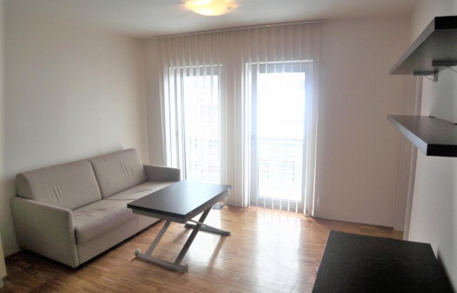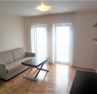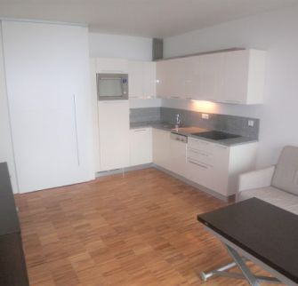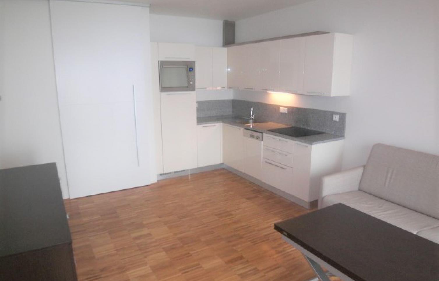 Interiér bytu o velikosti 43 m2, tvoří otevřený koncept obývacího pokoje/ložnicový prostor, moderní italská kuchyňská linka s veškerým příslušenstvím a vybavením, komplet zařízeno.