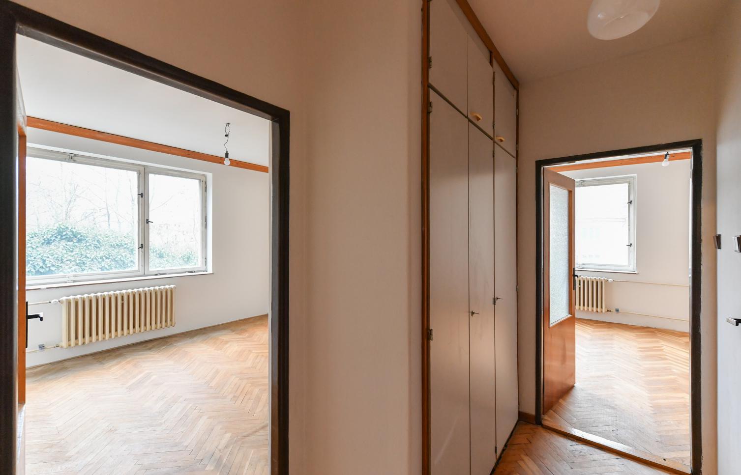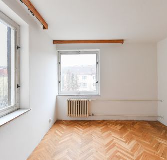 Na podlahách jsou velmi zachovalé parkety, okna jsou původní, výtah není.