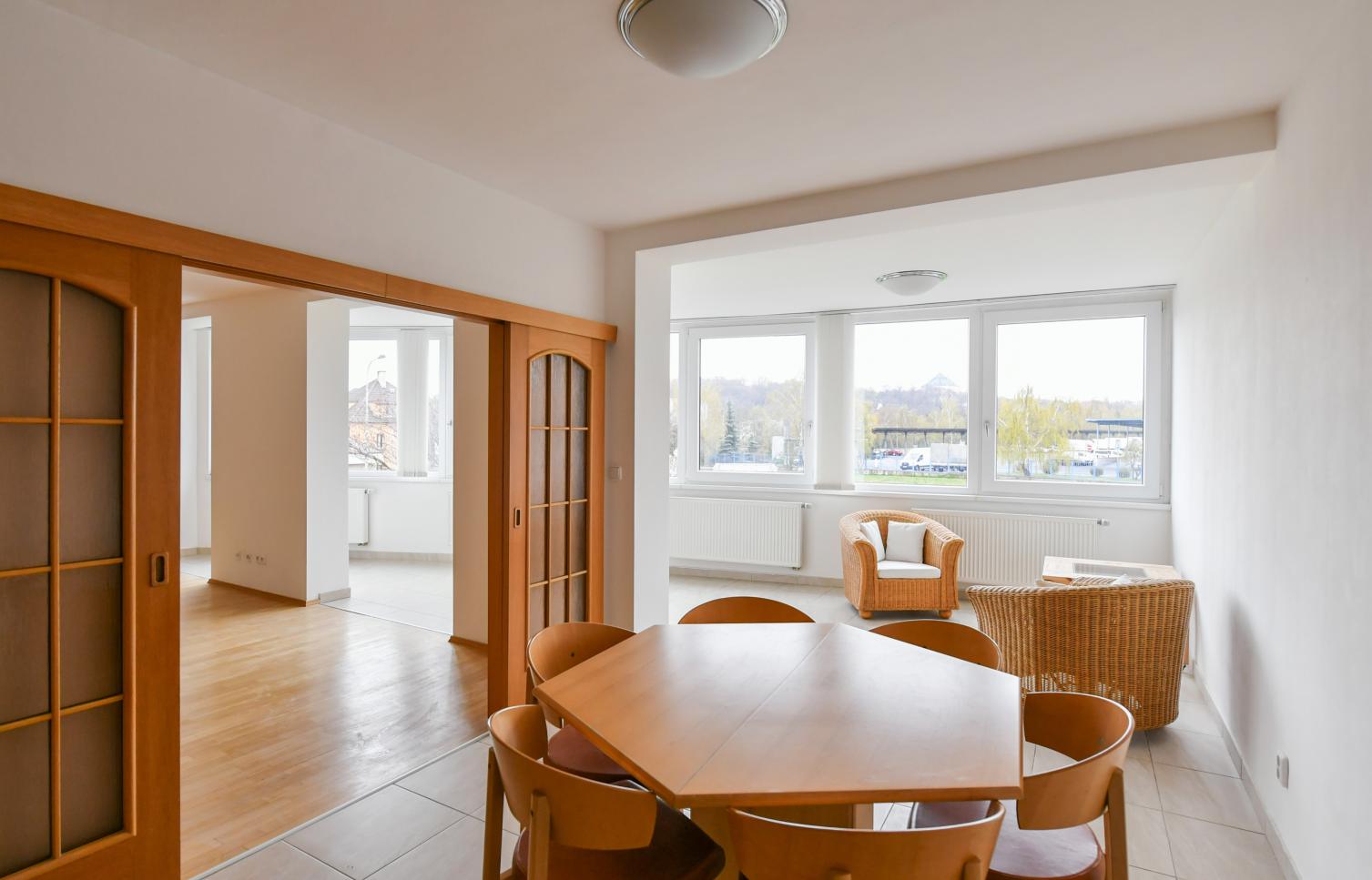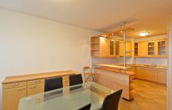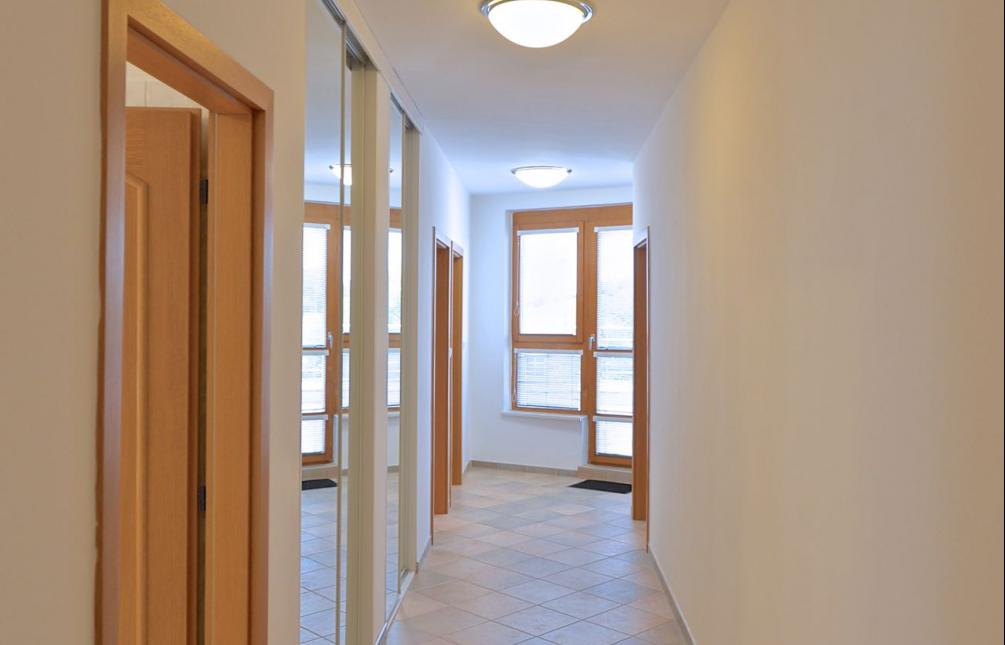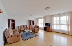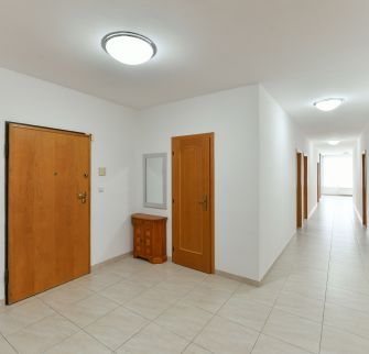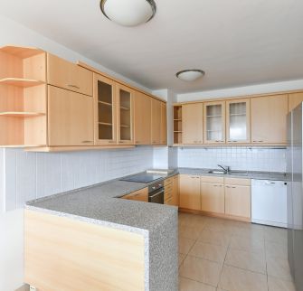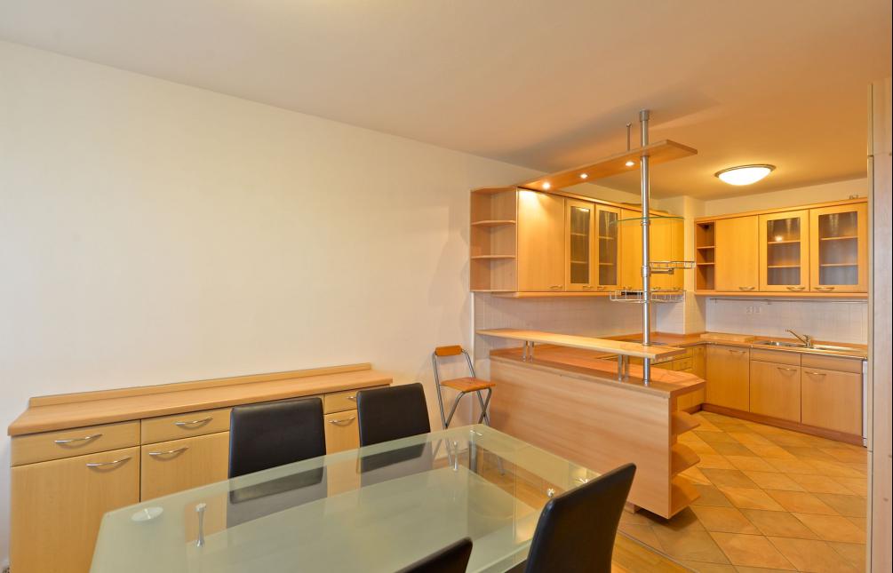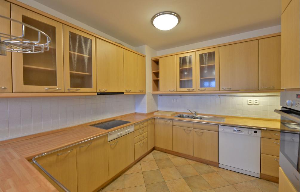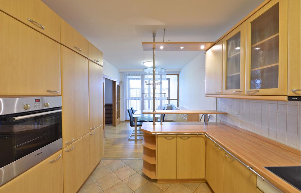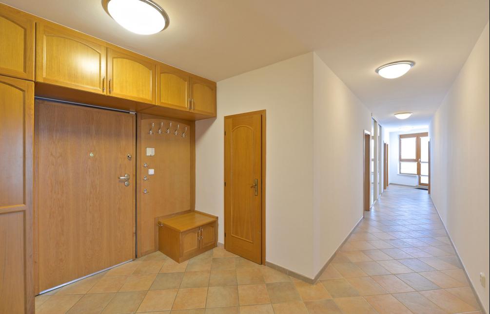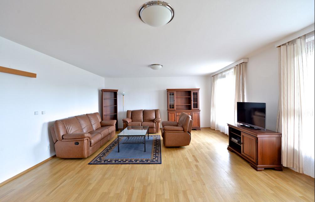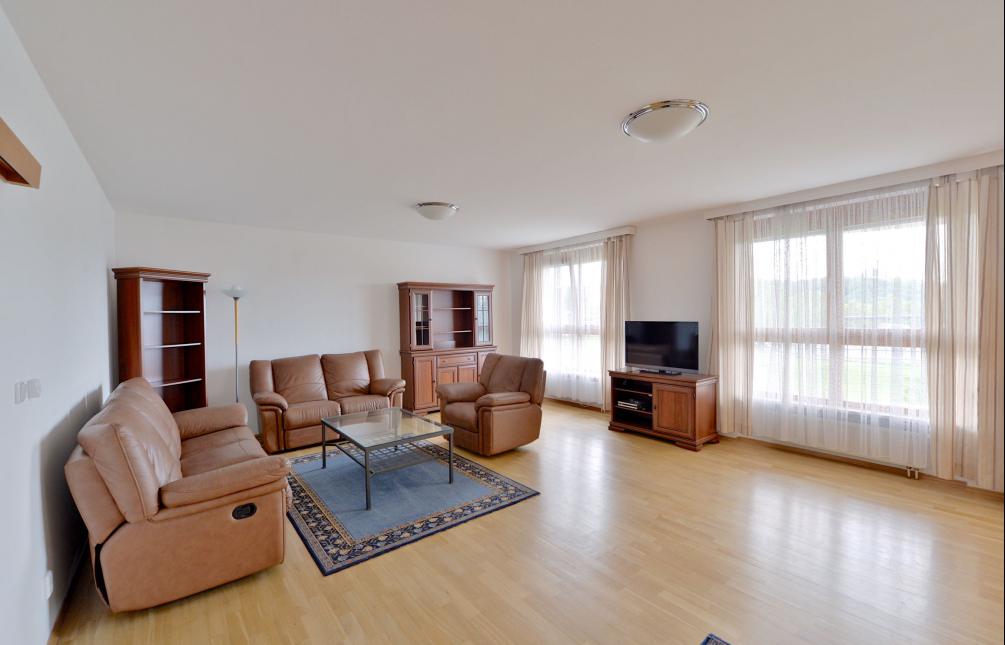 Dispozice bytu: tři ložnice, obývací pokoj, plně zařízená kuchyně, jídelna, dvě koupelny. Bezpečnostní vstupní dveře, videotelefon, alarm, 24 hodin bezpečnostní služba. Bezpečné parkování, parkovací místo možno v garáži za příplatek.