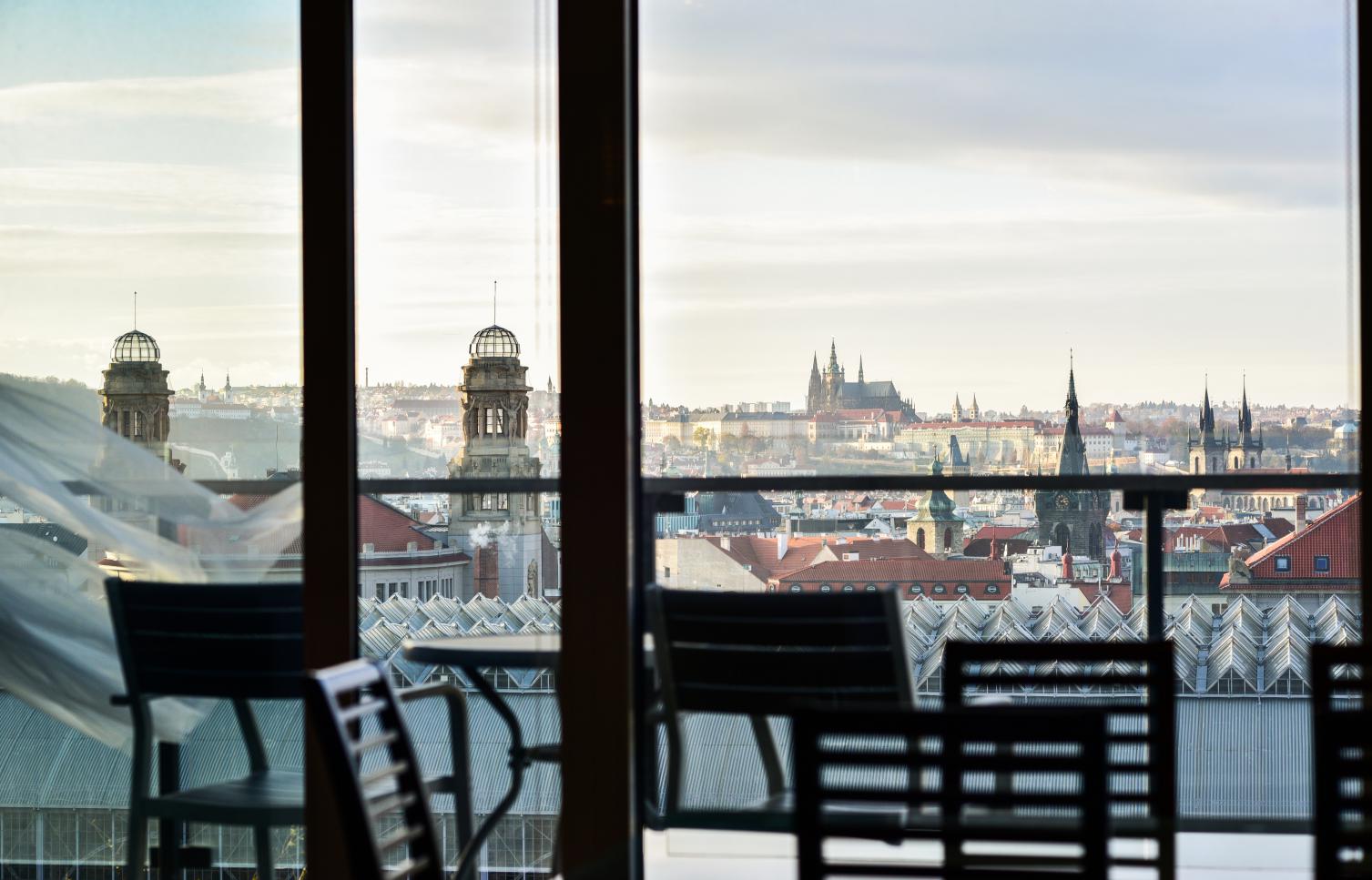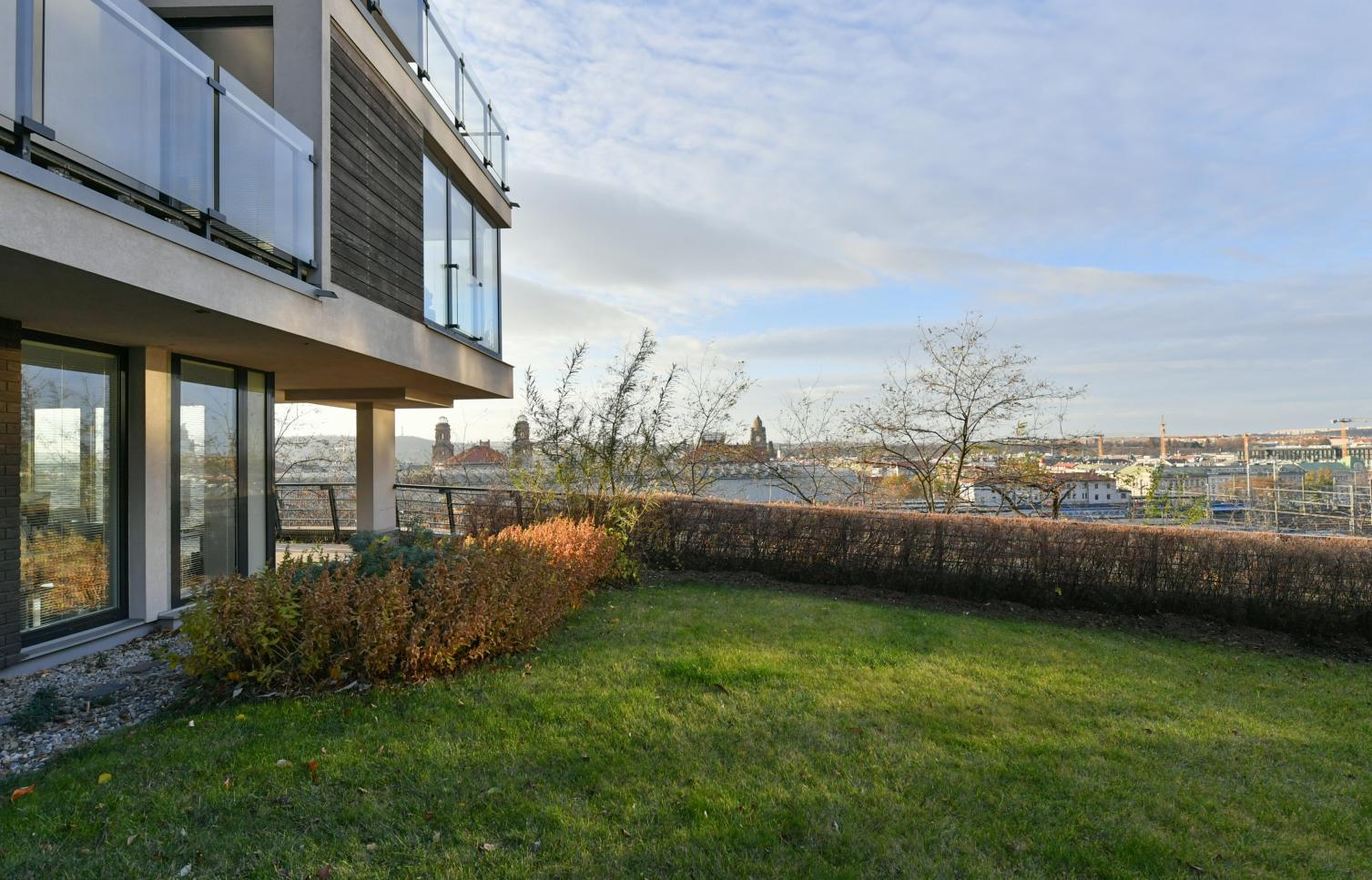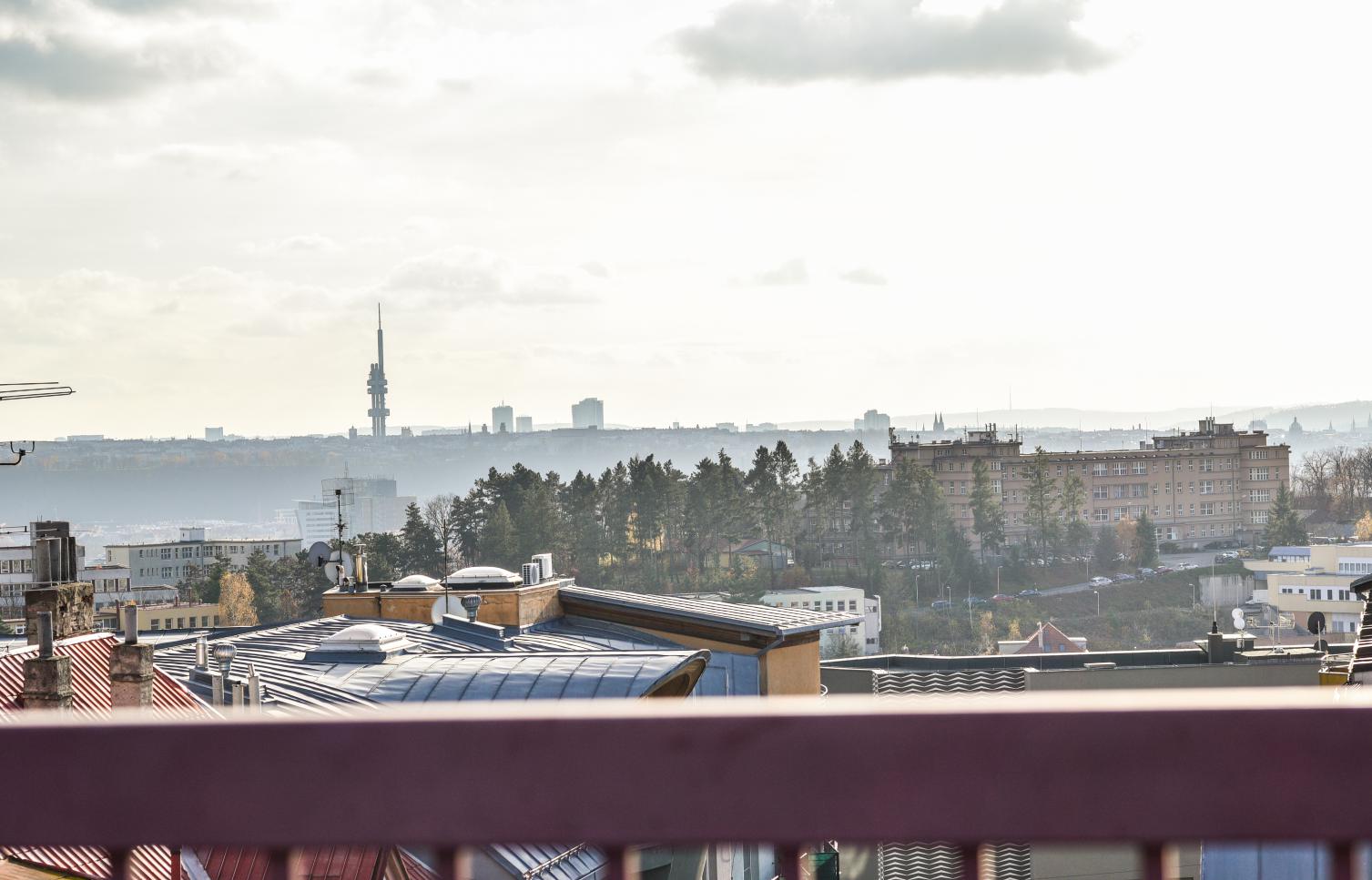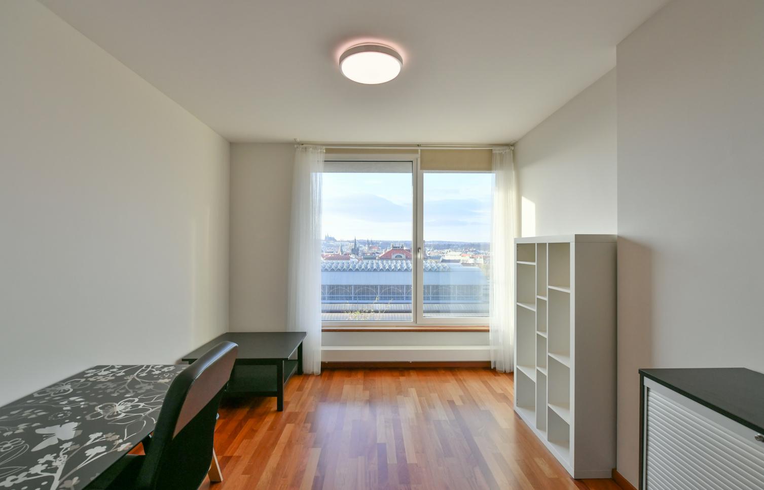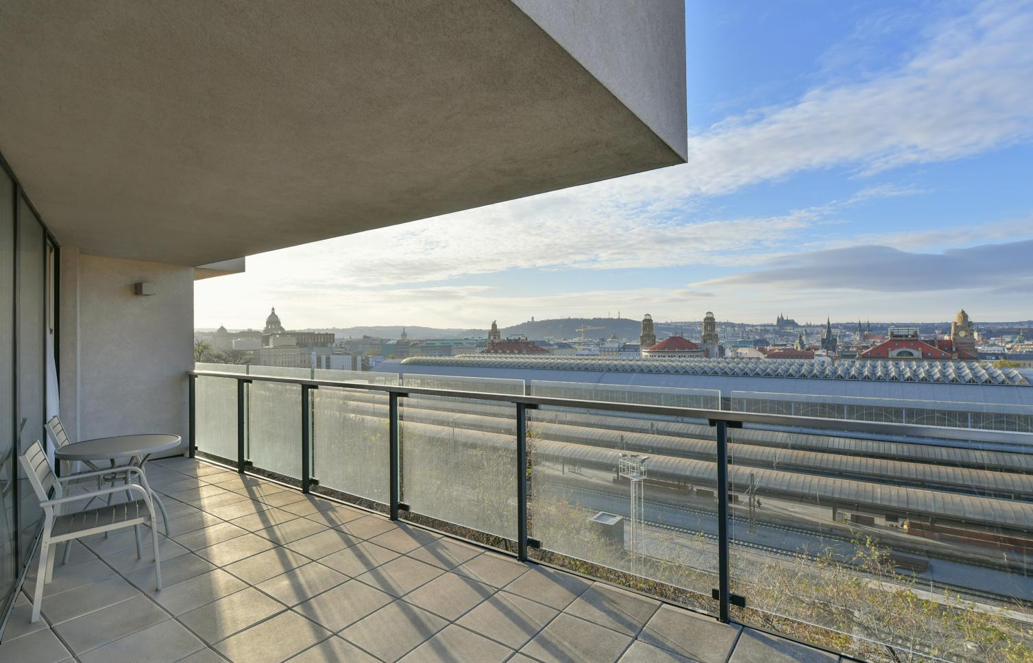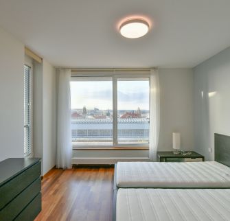 Vkusně zařízený, plně klimatizovaný byt se slunnou terasou poskytující výhledy na Pražský hrad, Staré Město a Malou Stranu ve 2. patře moderního rezidenčního komplexu s recepcí, 24/7 ostrahou a podzemním parkováním. Občanská vybavenost je na vysoké úrovni, v blízkosti rezidence najdete kvalitní restaurace, kavárny, školky a školy, obchody a mnoho potřebných služeb. Stanice metra Muzeum, pěšky na tramvaj.