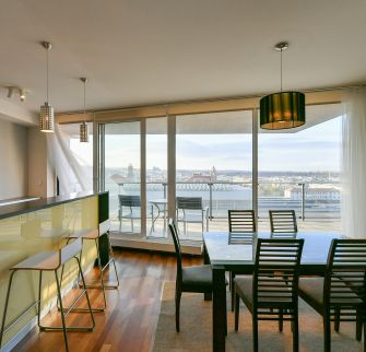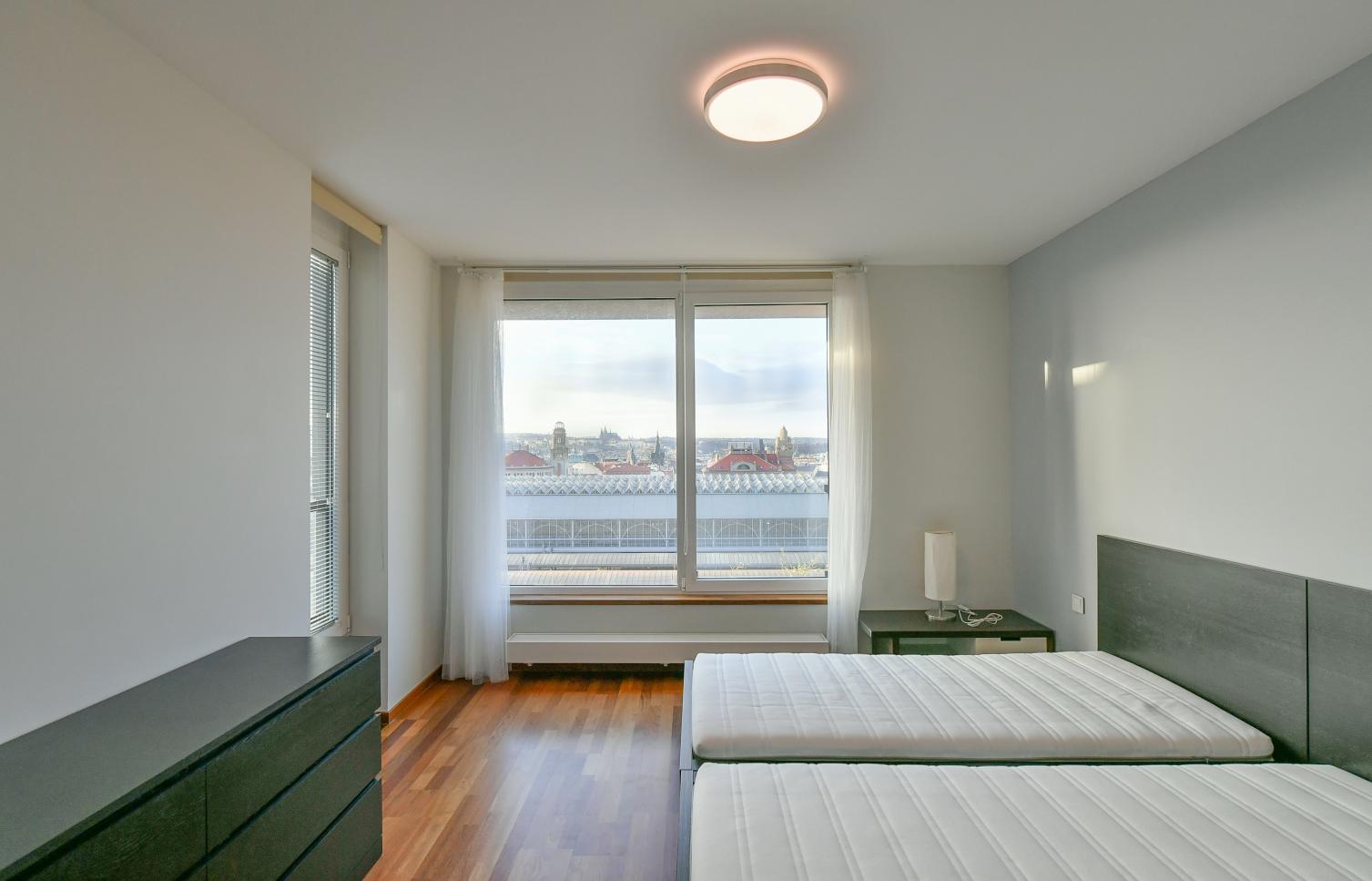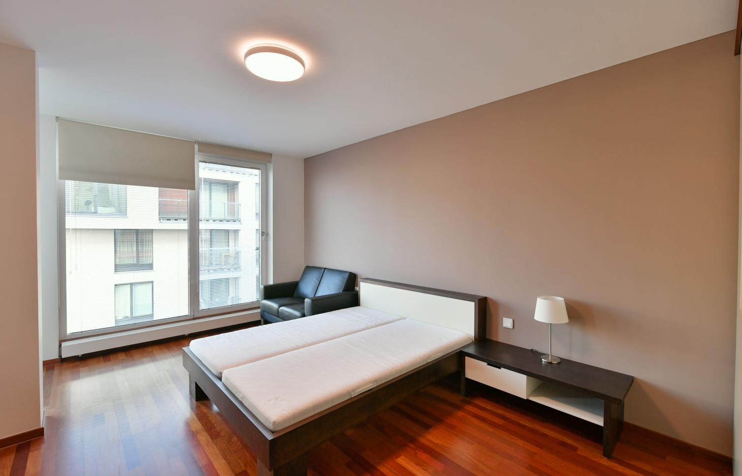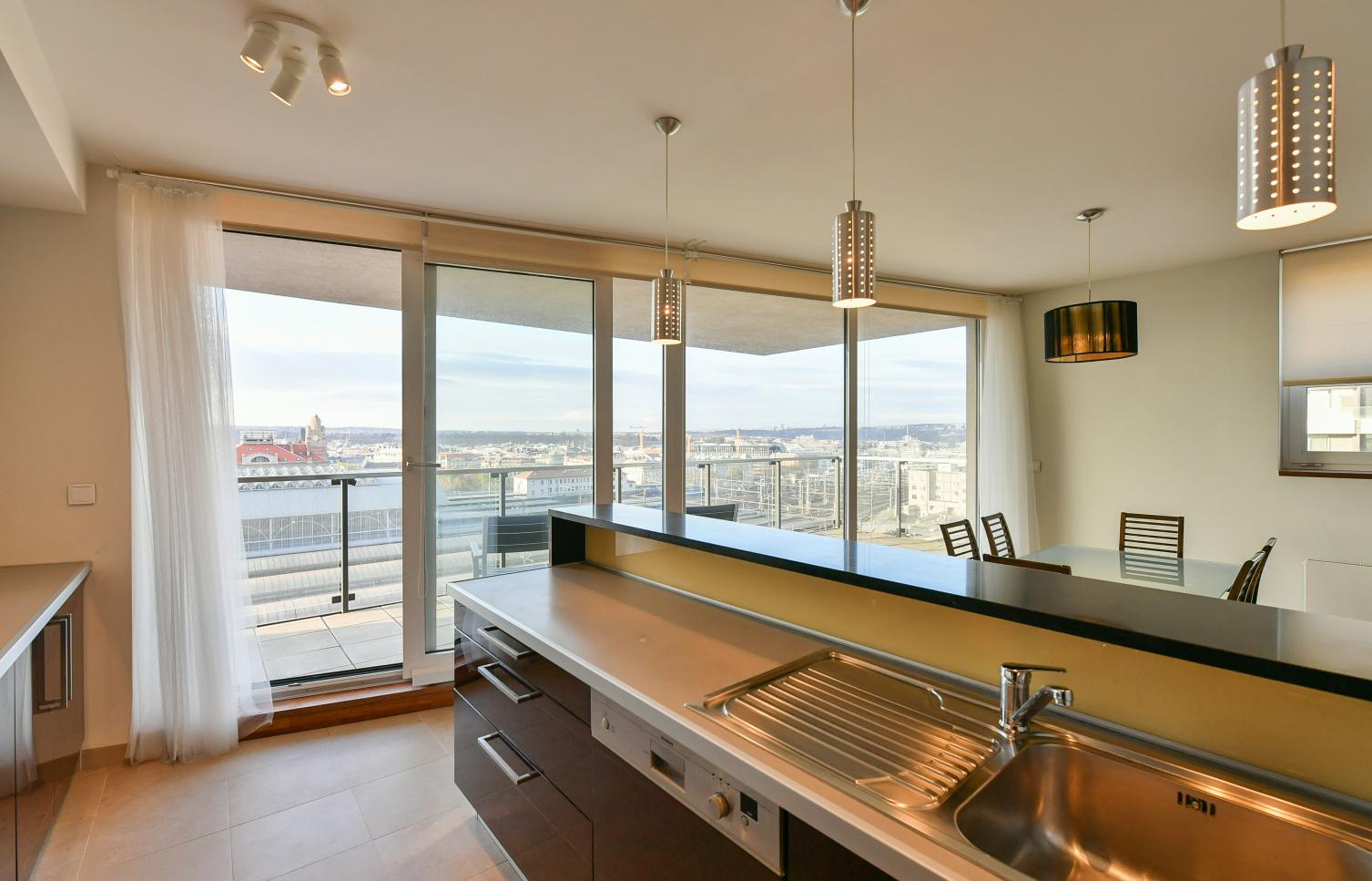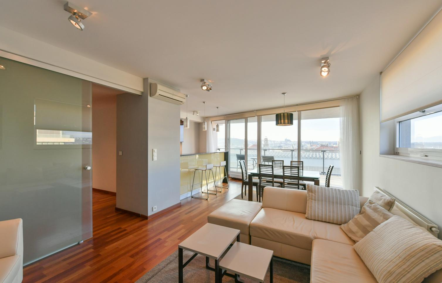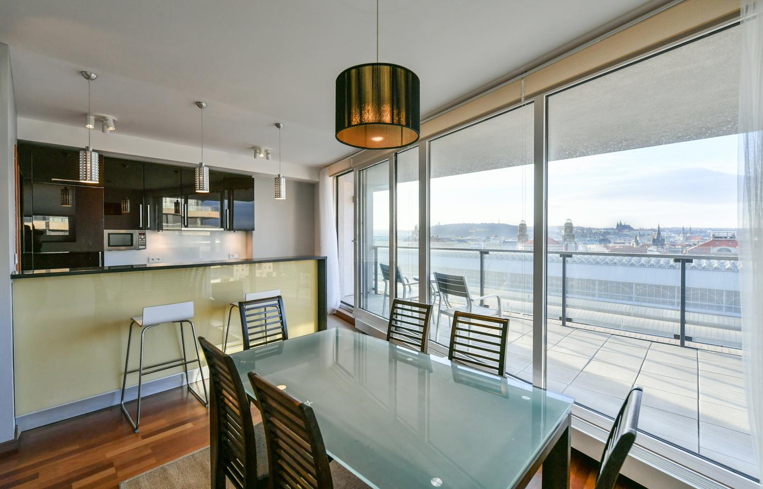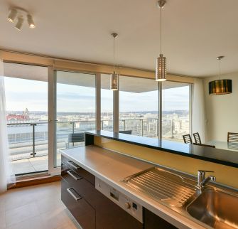 Vkusně zařízený, plně klimatizovaný byt se slunnou terasou poskytující výhledy na Pražský hrad, Staré Město a Malou Stranu ve 2. patře moderního rezidenčního komplexu s recepcí, 24/7 ostrahou a podzemním parkováním. Občanská vybavenost je na vysoké úrovni, v blízkosti rezidence najdete kvalitní restaurace, kavárny, školky a školy, obchody a mnoho potřebných služeb. Stanice metra Muzeum, pěšky na tramvaj.
