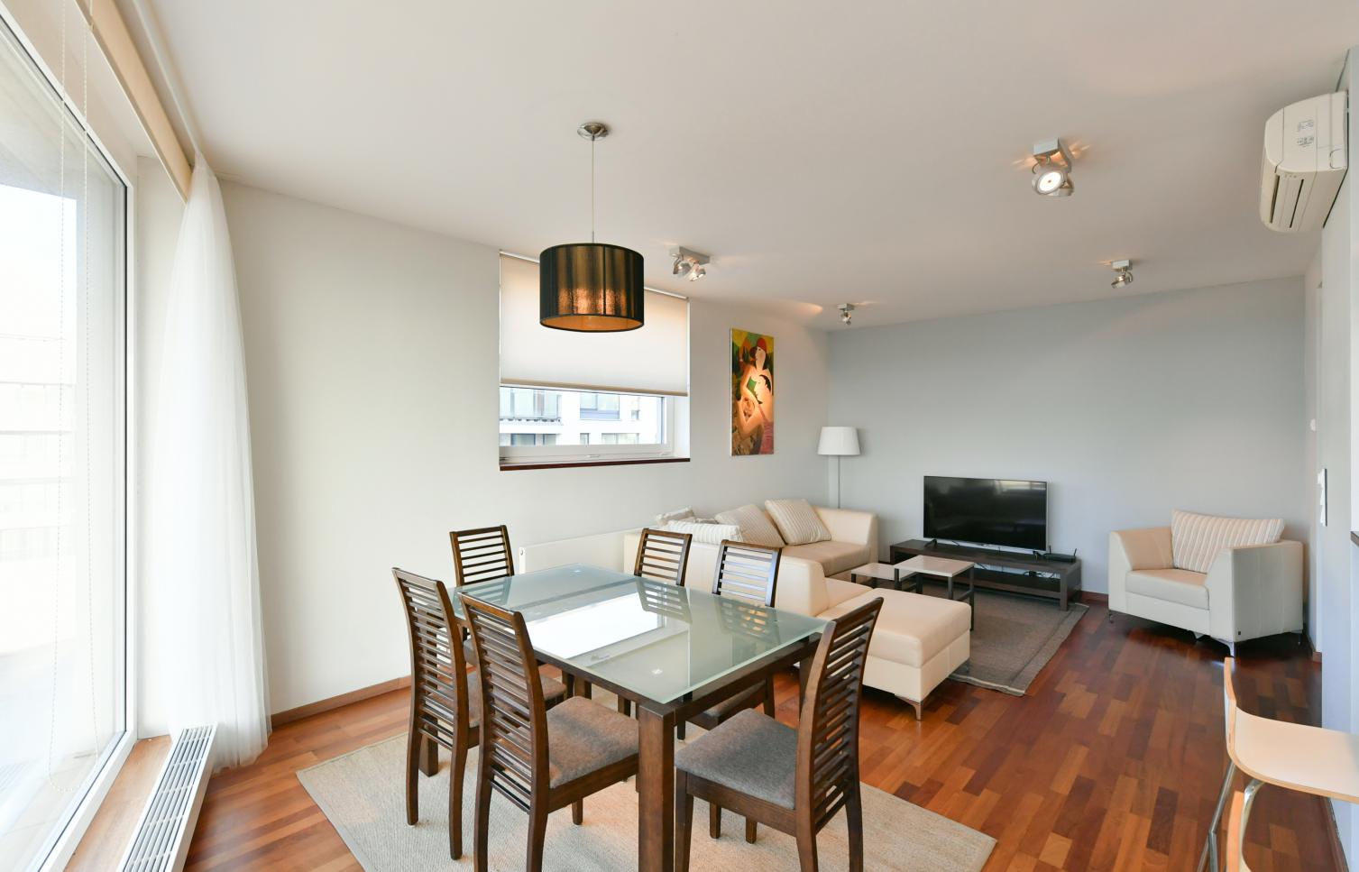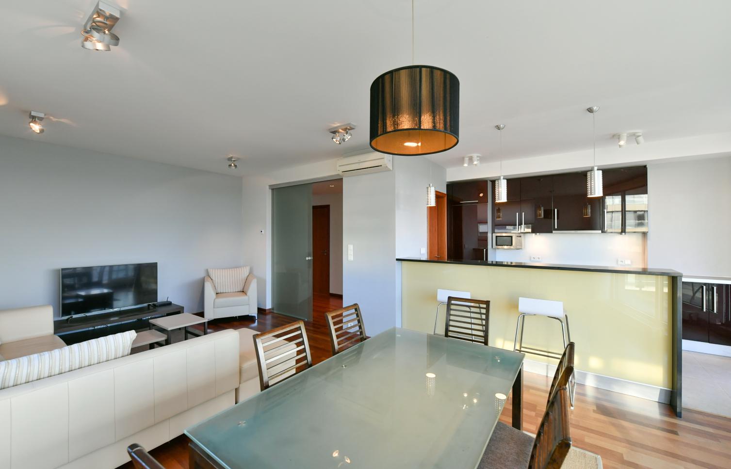 Interiér bytu nabízí otevřený koncept obývacího pokoje s plně vybaveným kuchyňským koutem, barovým pultem a jídelním prostorem. velkými francouzskými okny vedoucími na terasu (22 m2) a balkón (5 m2), tři ložnice, dvě koupelny (jednu s vířivou vanou, sprchovým koutem a WC, druhou se sprchovým koutem a WC). Celo prosklené stěny, parkety, pračka, vestavěné skříně ve všech pokojích, bezpečnostní dveře, kabelové a satelitní TV připojení; byt se nabízí plně zařízený luxusním nábytkem, vestavěné skříně ve všech ložnicích. K bytu náleží sklep (4 m2). Vstup do rezidence je monitorován, v celém objektu včetně garáží je instalován kamerový systém.
