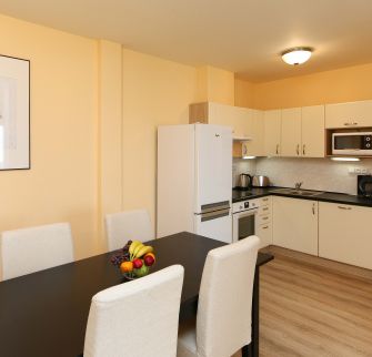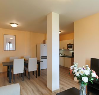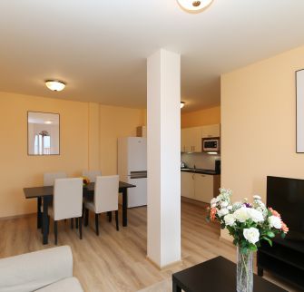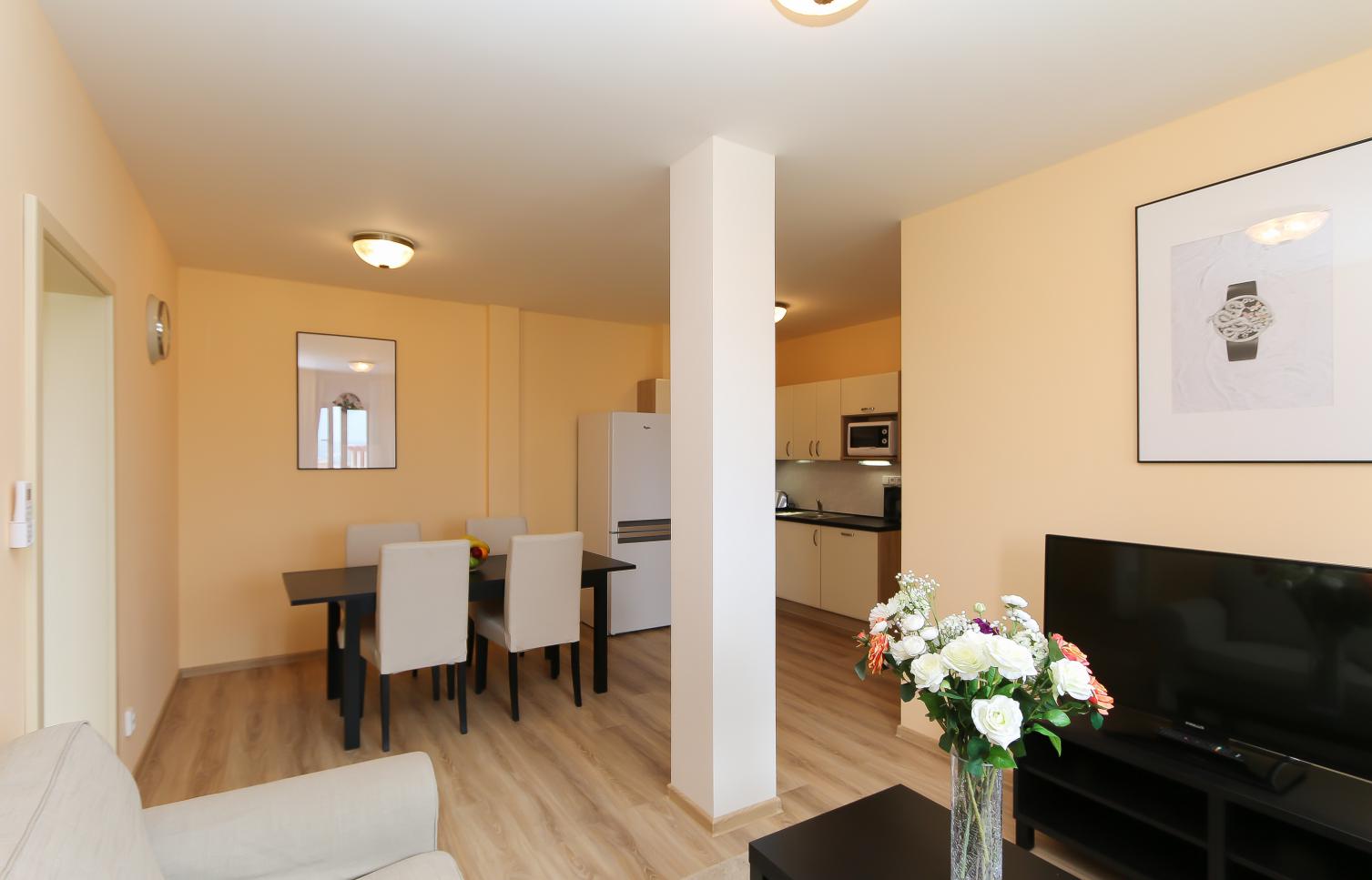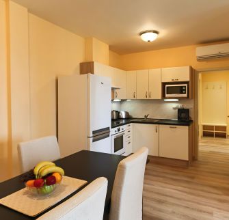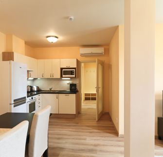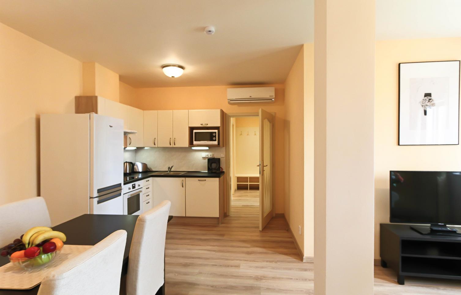 Interiér bytu zahrnuje: vstupní hala, obývací pokoj s plně vybavenou kuchyní, 2 ložnice, koupelna se sprchovým koutem, samostatná toaleta, technická komora.