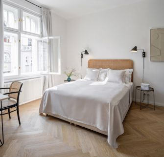 Nově postavený byt ve 3. patře dobře udržovaného historického bytového domu bez výtahu. Dům stojí v klidné ulici v Praze 6 – Dejvice, pouhou minutu chůze od stanice metra a tramvajových zastávek Hradčanská. Tato lokalita rovněž disponuje množstvím obchodů, restaurací a kaváren. Velmi blízko je také největší park ve městě – park Stromovka. Byt disponuje : obývací pokoj, ložnice, oddělená šatnu, koupelna se sprchovým koutem a toaletou a plně vybavena kuchyň. V prostorném obývacím pokoji jsou původní a funkční kamna a jídelní kout. Zabezpečovací systém je součástí bytu. V těsném sousedství se nachází velké množství restaurací a francouzské bistro přímo v domě. Tělocvična 15 m od domu a masáže 25m od domu.