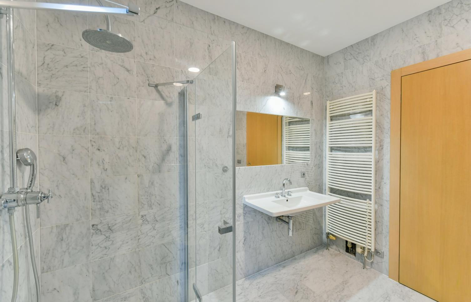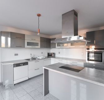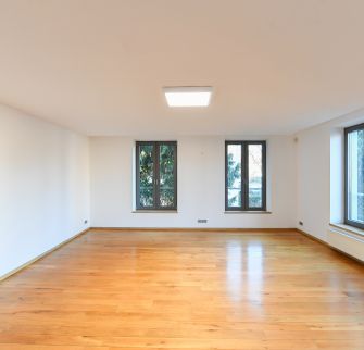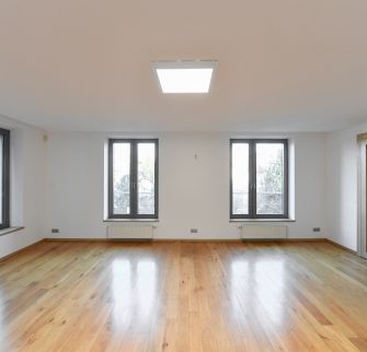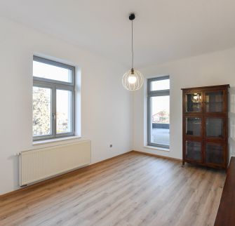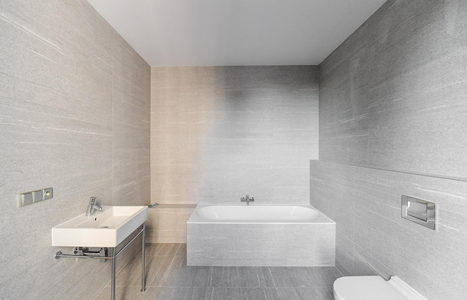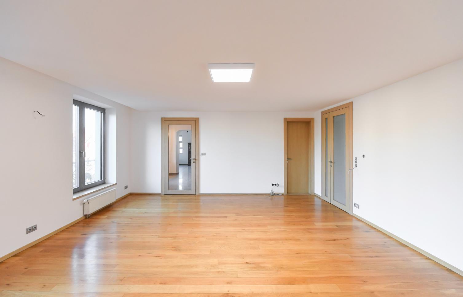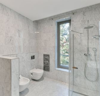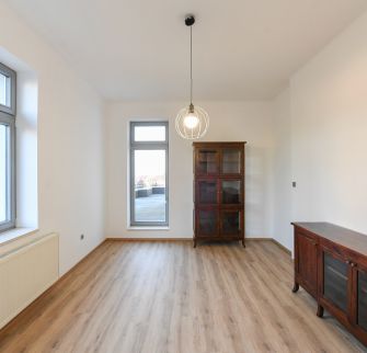 Na podlahách kvalitní dřevěná podlaha, v koupelnách velkoformátová dlažba, moderní dizajn.