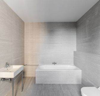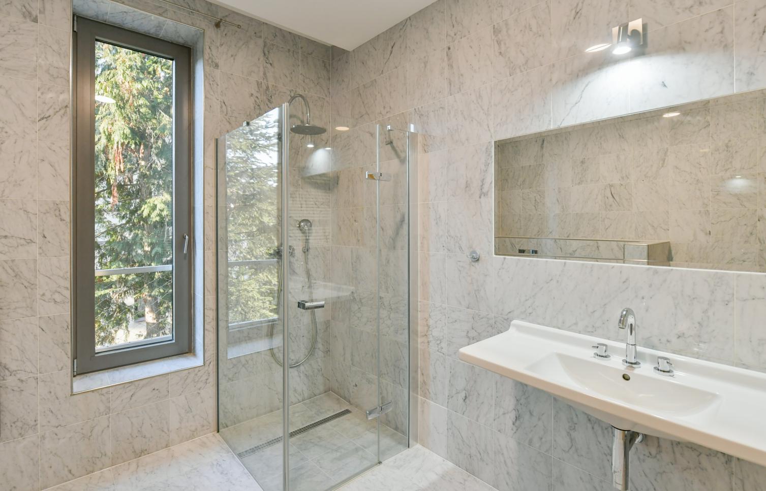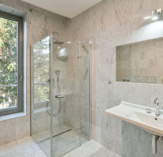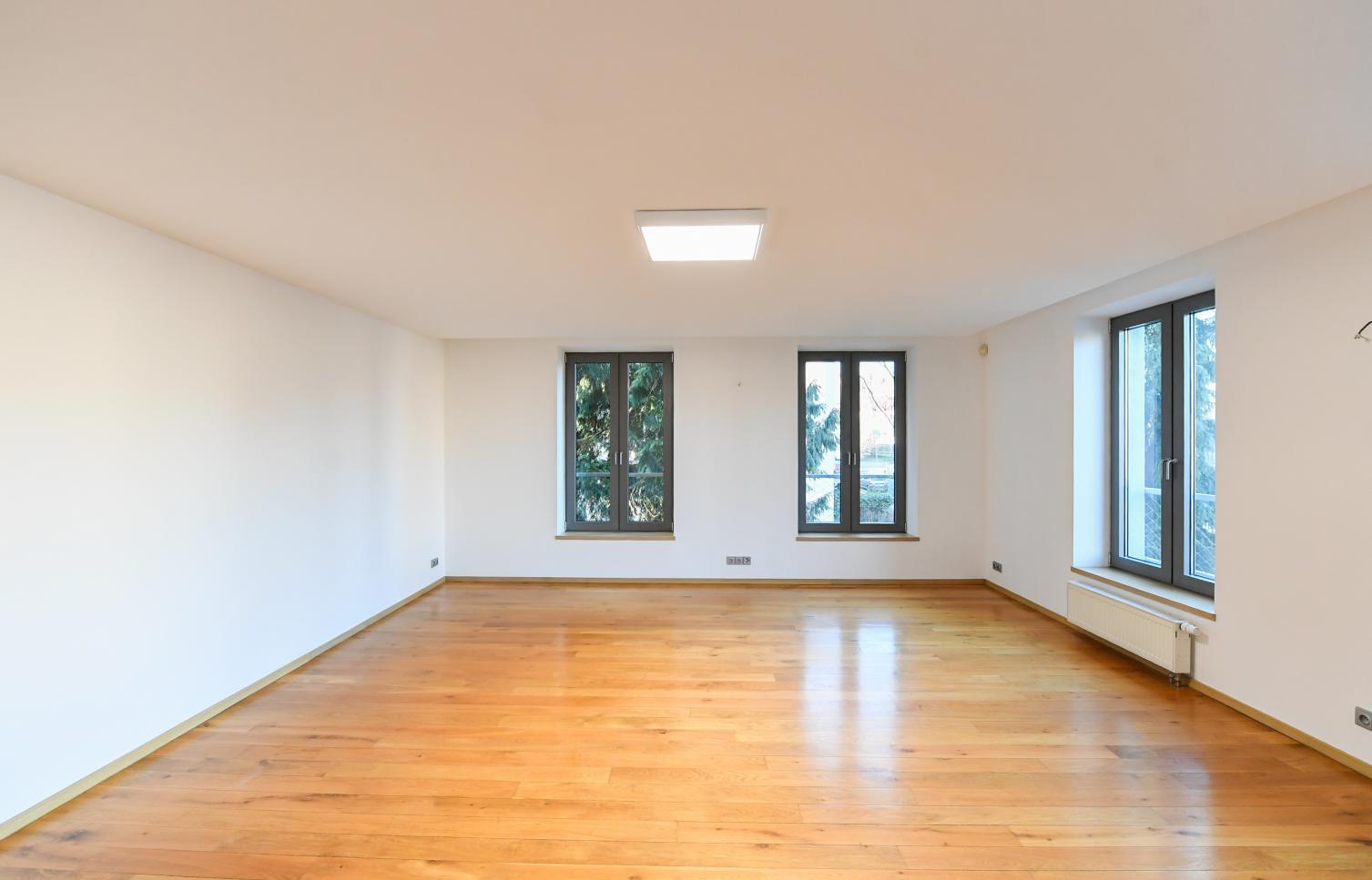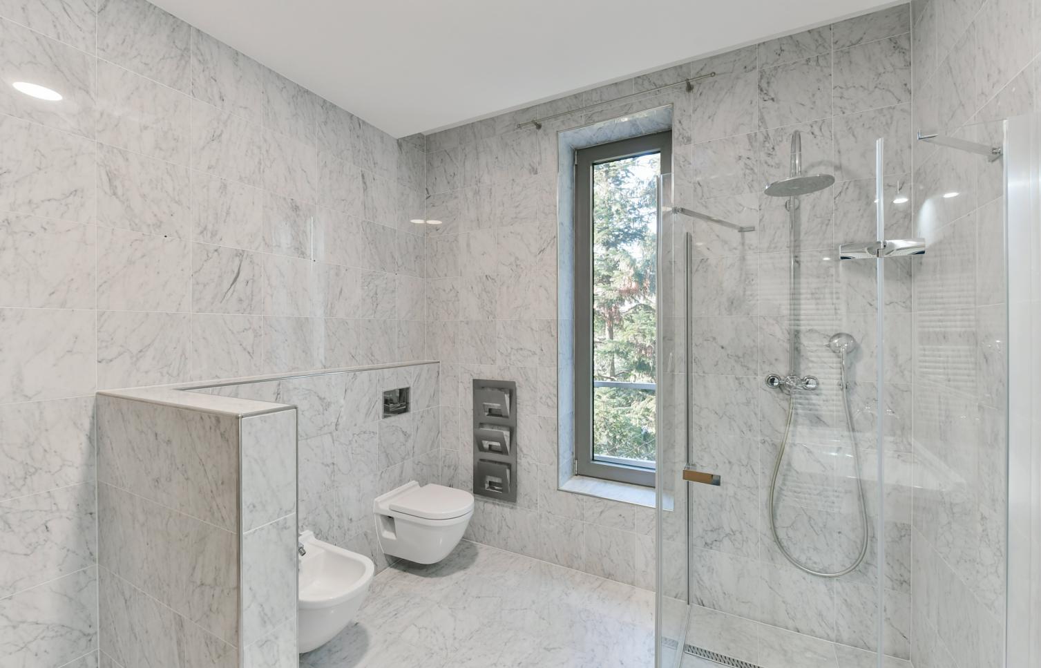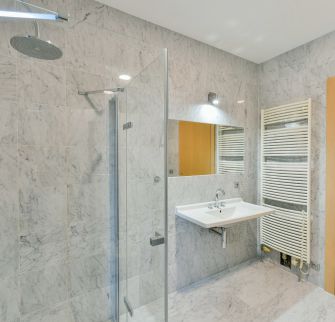 Na podlahách kvalitní dřevěná podlaha, v koupelnách velkoformátová dlažba, moderní dizajn.