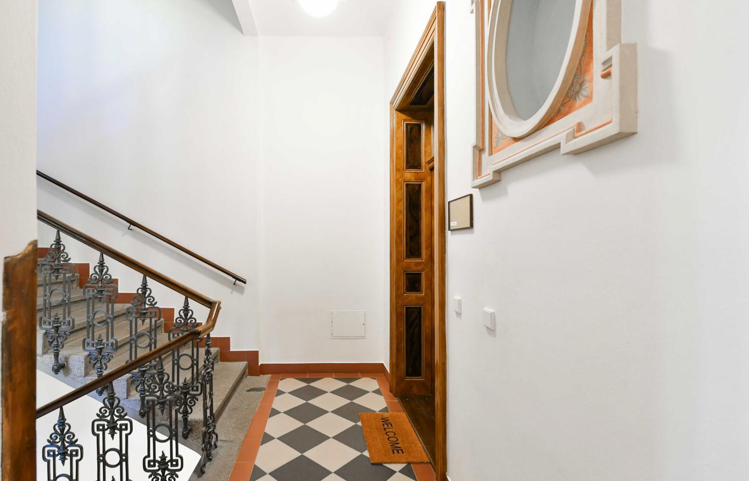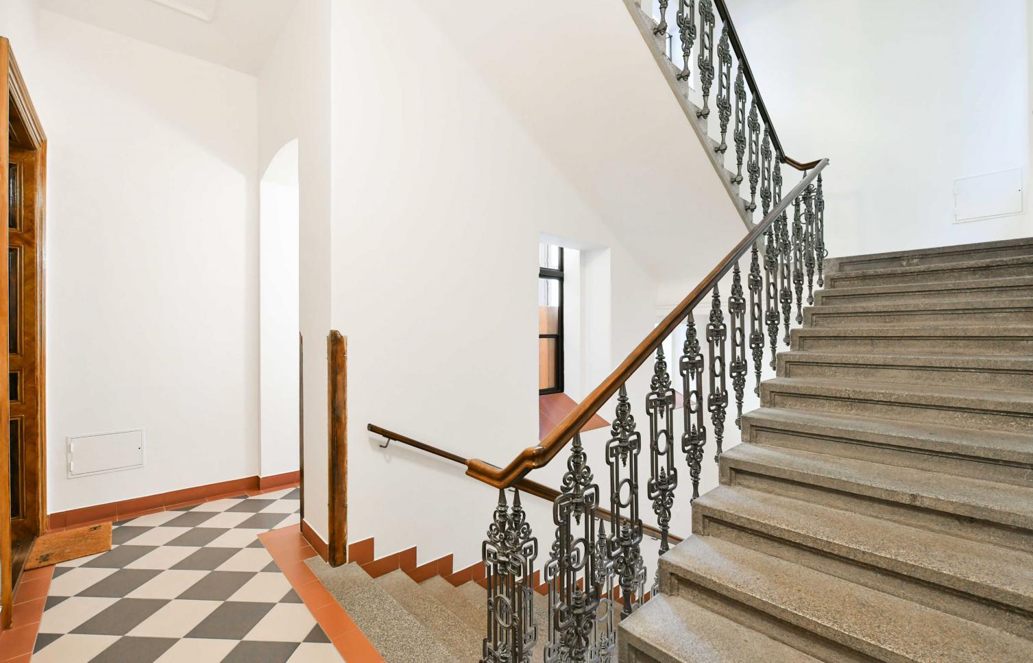 Interiér bytu sestává: vstupní hala s vestavěnou skříní, plně vybavená samostatná kuchyň, obývací pokoj (vysoké stropy a štuk), ložnice přístupná z obývacího pokoje s vlastní koupelnou se sprchovým koutem a toaletou, toaleta pro hosty. Nemovitost je charakteristická množstvím originálních historických prvků - vysoké stropy, dřevěné parketové podlahy, štuky. Vybavení bytu: pračka, sušička, myčka, kabelová TV, satelitní příjem, PC síť, domácí vrátný. Možnost parkování za 2.700-4.700 Kč/měsíc plus DPH. Cena pronájmu garážového stání je v závislosti na velikosti vozu. Poplatky za společné domovní služby jsou zahrnuty v ceně nájmu. Úhrada za spotřebu/ převod na jméno nájemce. Byt je k dispozici zařízený nebo nezařízený.