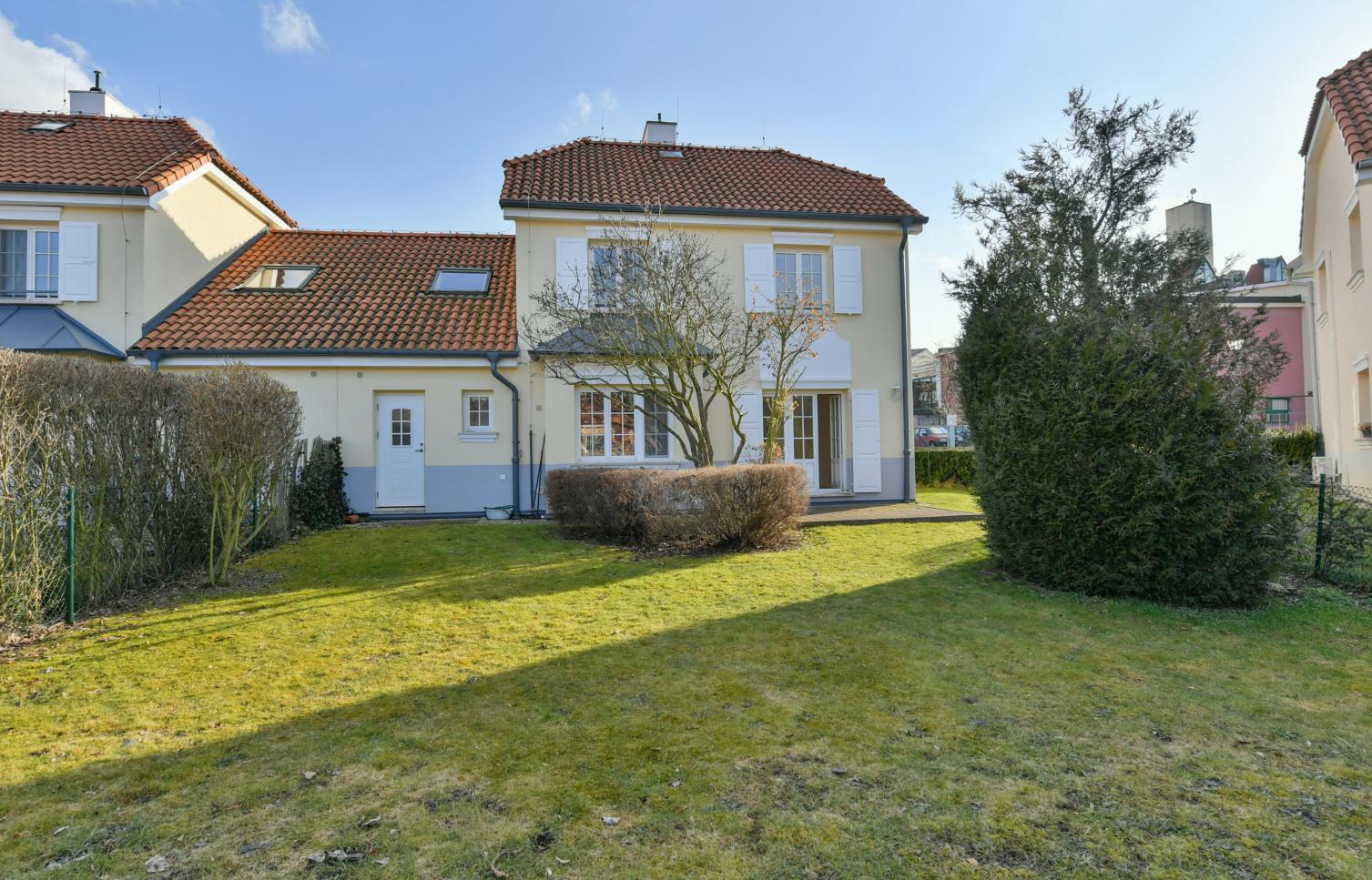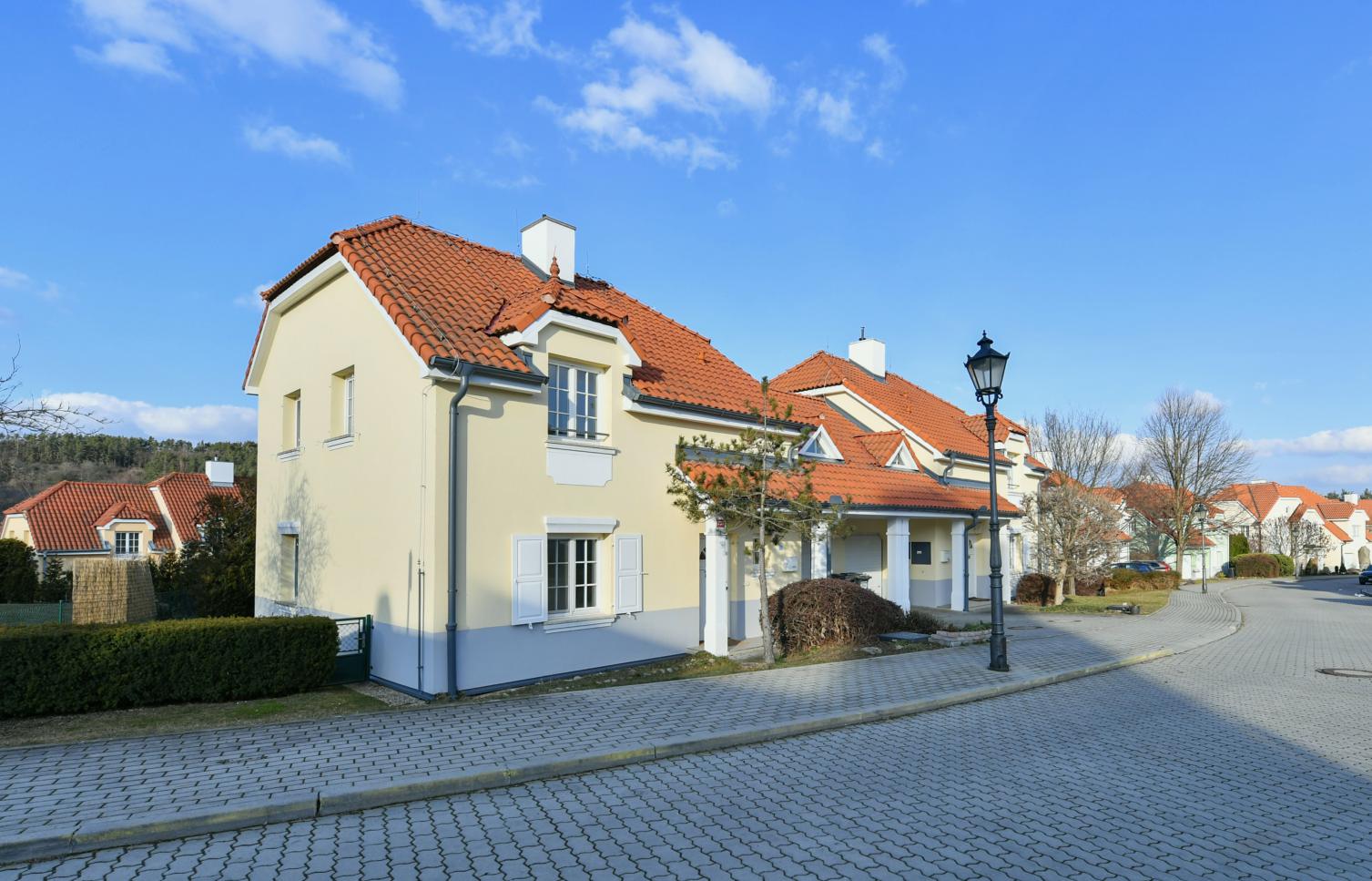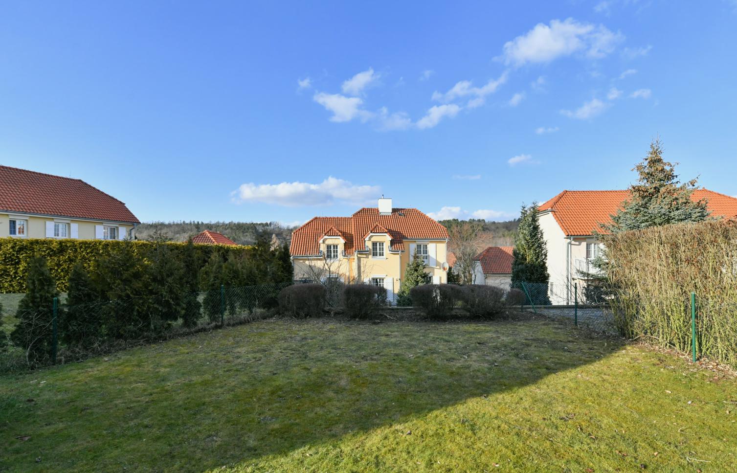 Podkrovní úložný prostor, plynové topení, pračka, alarm, satelitní TV připojení, internet. Každý dům v areálu má vlastní spojení s 24h bezpečnostní službou, komunikace v areálu spravuje soukromá firma. Záloha na poplatky 10.000 Kč měsíčně (společné poplatky za služby v areálu, odvoz odpadu, voda, elektřina a plyn v domě).