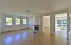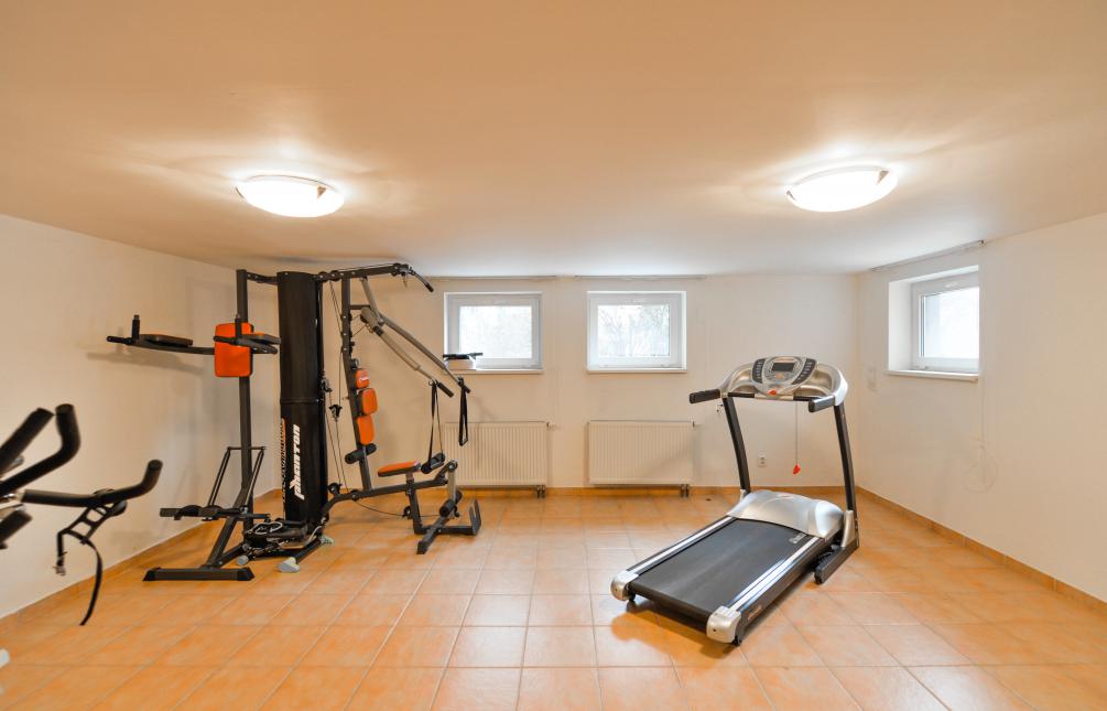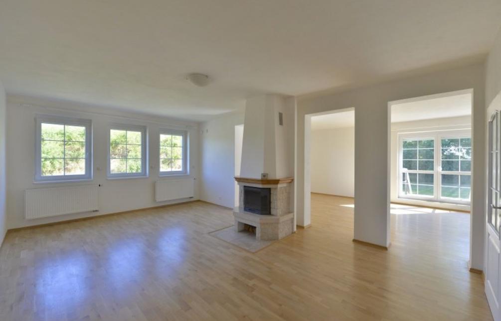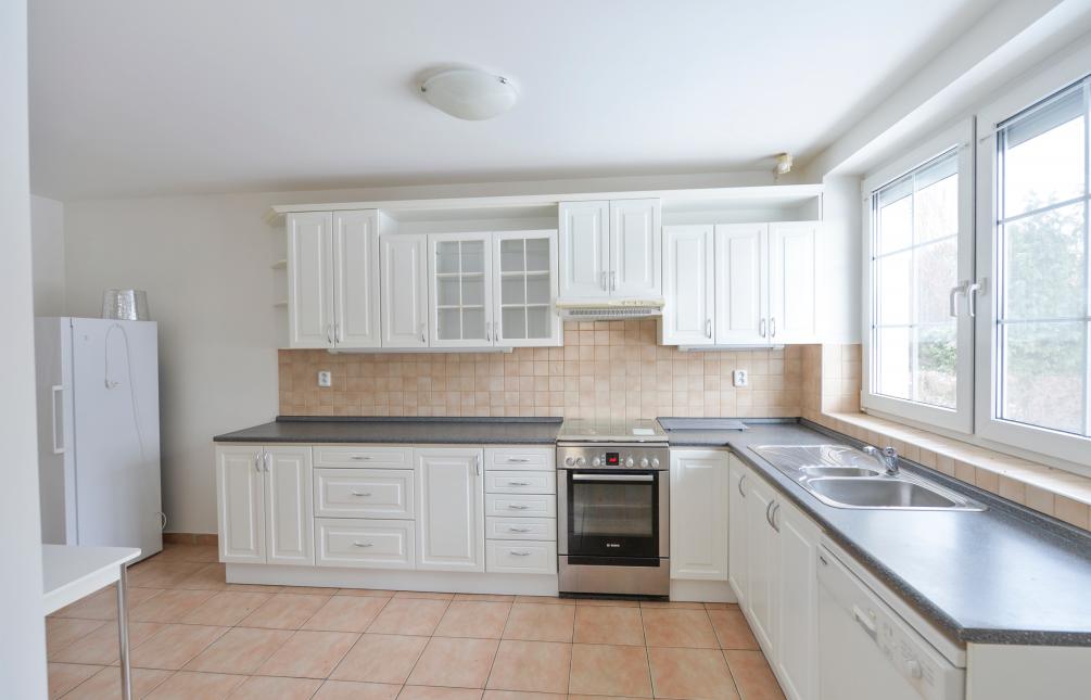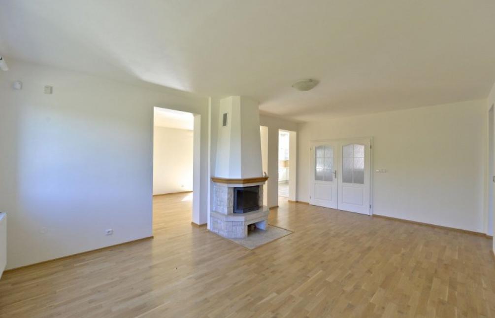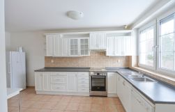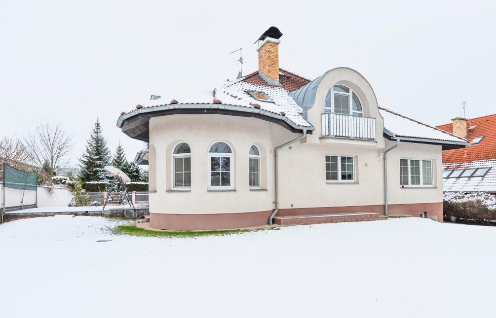 Velký přízemní otevřený prostor nabízí obývací pokoj (42 m2) s krbem, jídelnu, kuchyň s francouzskými okny na terasu a zahradu, dvě ložnice, koupelnu ze sprchovým koutem, samostatné WC, halu - vestavěné šatní skříně, schodiště do patra a suterénu. Nová kuchyňská linka vybavená veškerým komfortem - myčka nádobí, vestavěná varná deska, vestavěná elektrická trouba, odsavač par, lednice s mrazákem - začleněna do největší místnosti v domě. V prvním patře jsou tři ložnice s loggiemi, plně vybavena koupelna (sprchový kout/vana/WC) a centrální hala. V suterénu je umístěna sauna s odpočívárnou, prádelna, koupelna ze sprchovým koutem, hobby místnost a technické zázemí. K dalšímu vybavení patří vestavěné šatní skříně, elektronické zabezpečovací zařízení napojené na PCO, parkety, obklady a dlažby, vestavěné skříně v předsíni, satelitní TV připojení. Garáž pro dva vozy. Zálohy na služby a spotřebu energií včetně údržby zahrady cca 13 000 Kč/měsíc.