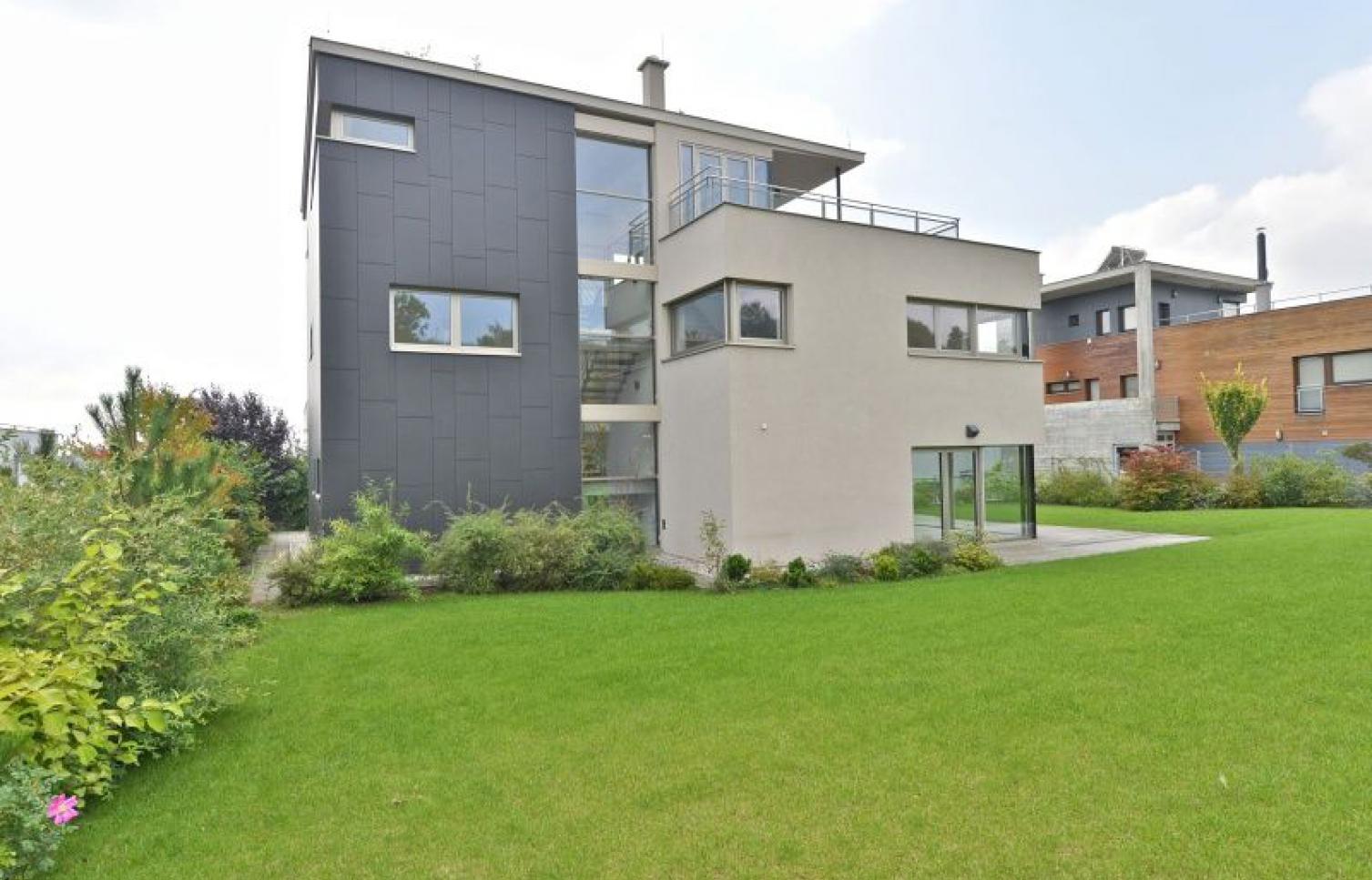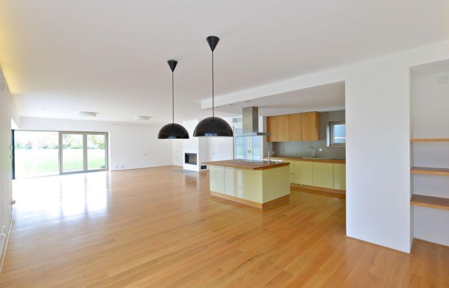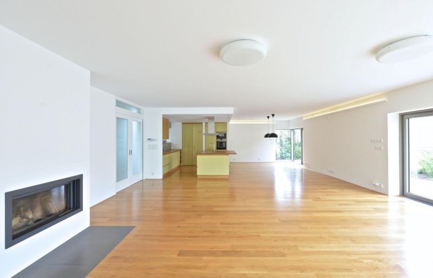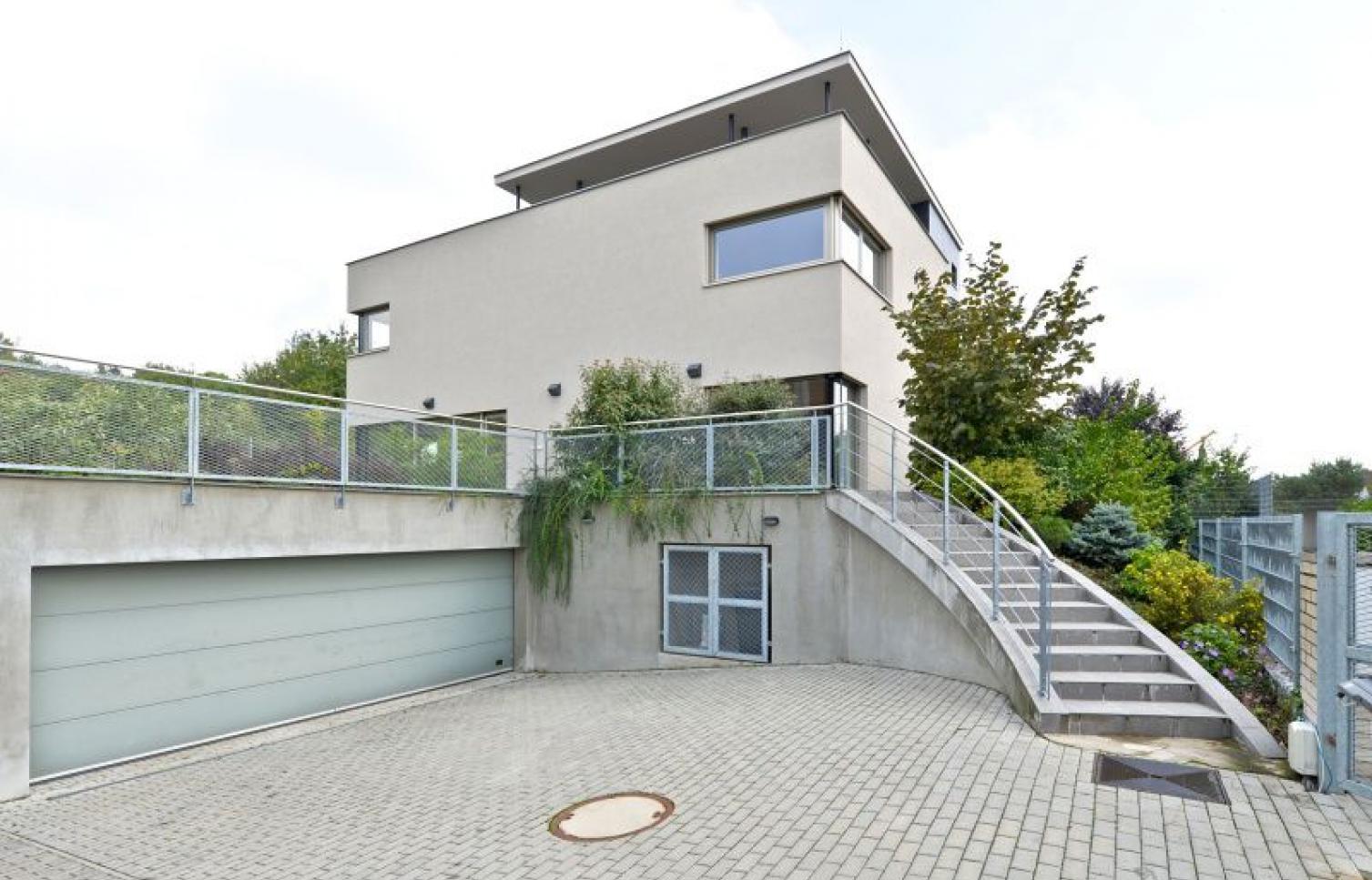 Denní společenskou zónu vily tvoří rozlehlý přízemní otevřený prostor obývacího pokoje s kuchyní, jídelnou a přímým vstupem na profesionálně upravenou zahradu. Celá spodní fasáda domu směrem do zahrady je bohatě prosklena a v letních měsících umožní velkoformátové posuvné dveře propojit interiér s exteriérem velmi intenzivně. Dům nabízí celkem 6 ložnic, 5 koupelen a 2 velké terasy. Poslední patro s otevřenou dispozicí a čajovou kuchyňkou, ze sociálním zázemím, terasou - možno využít jako samostatnou jednotku. V suterénu je prádelna/kotelna, koupelna (sprchový kout, umyvadlo a toaleta), sklep, fitness či skladovací místnost a velká dvougaráž. Celý dům je klimatizován.